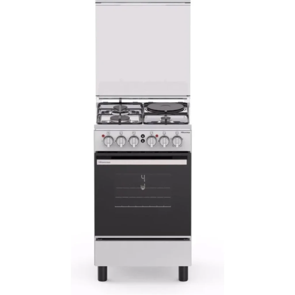 Hisense Cooker, 3 Gas Burners Plus 1 Electric Hot Plate Cooker, Dual Fuel Cooking System With Gas And Electric Hob, Spacious Oven With Integrated Grill Function, Automatic Ignition Technology, Enamel Pan Supports, Front Control Knobs, Oven Interior Light, Durable Freestanding Kitchen Cooker Design Brand new