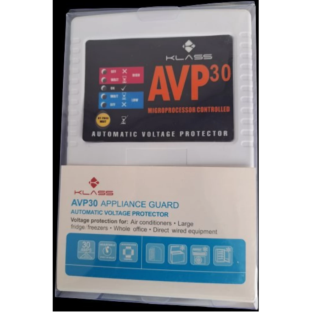 Klass AVP 30 Automatic Voltage Protector, 30A High Capacity Power Guard, Single Phase 230V Operation, Over And Under Voltage Cut-Off Protection, Automatic Delay Restart System, Microprocessor Controlled Switching, LED Status Indicators, Heavy Duty Appliance Protection Design. | MobileShop Uganda